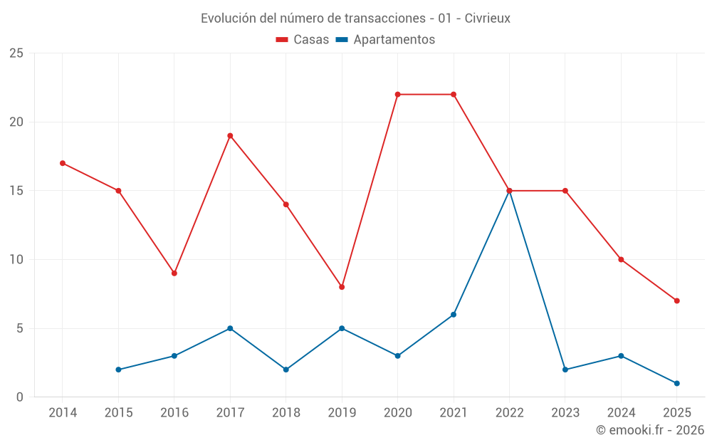 El precio mediano en las 28 transacciones de casas de los últimos 24 meses en la comuna de Civrieux fue de 3 262 € por metro cuadrado para un valor patrimonial medio de 351 475 €. Durante este período el 60% de las transacciones estuvieron entre 2 562 y 3 838 € por metro cuadrado (del 2º al 8º decil).
