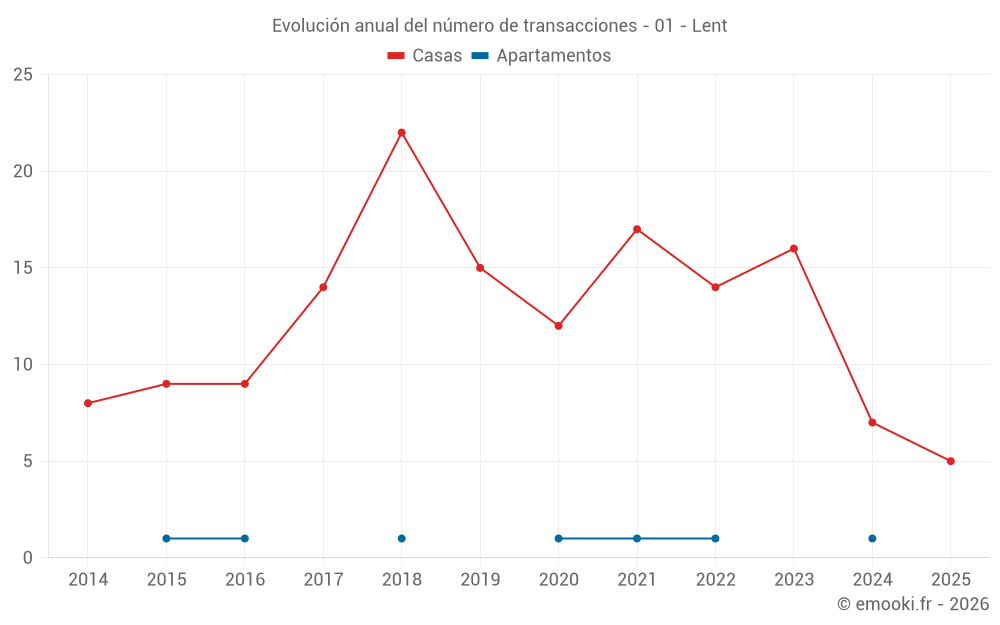 El precio mediano en las 20 transacciones de casas de los últimos 24 meses en la comuna de Lent fue de 2 338 € por metro cuadrado para un valor patrimonial medio de 213 500 €. Durante este período el 60% de las transacciones estuvieron entre 1 841 y 2 712 € por metro cuadrado (del 2º al 8º decil).