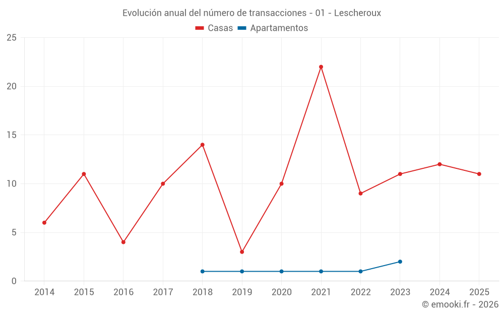 El precio mediano en las 23 transacciones de casas de los últimos 24 meses en la comuna de Lescheroux fue de 1 687 € por metro cuadrado para un valor patrimonial medio de 164 000 €. Durante este período el 60% de las transacciones estuvieron entre 843 y 2 074 € por metro cuadrado (del 2º al 8º decil).