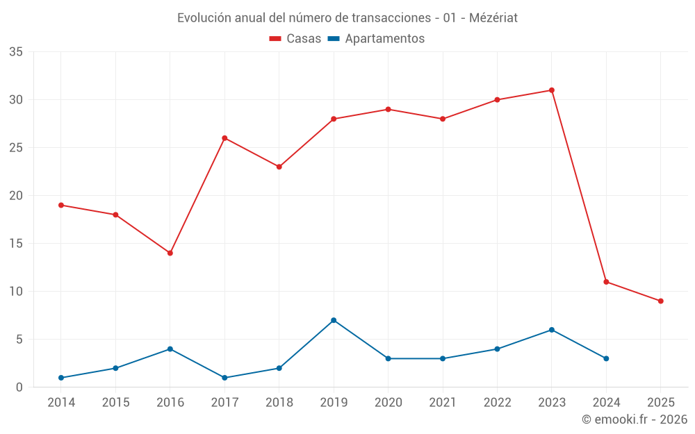El precio mediano en las 39 transacciones de casas de los últimos 24 meses en la comuna de Mézériat fue de 2 021 € por metro cuadrado para un valor patrimonial medio de 212 365 €. Durante este período el 60% de las transacciones estuvieron entre 1 434 y 2 564 € por metro cuadrado (del 2º al 8º decil).