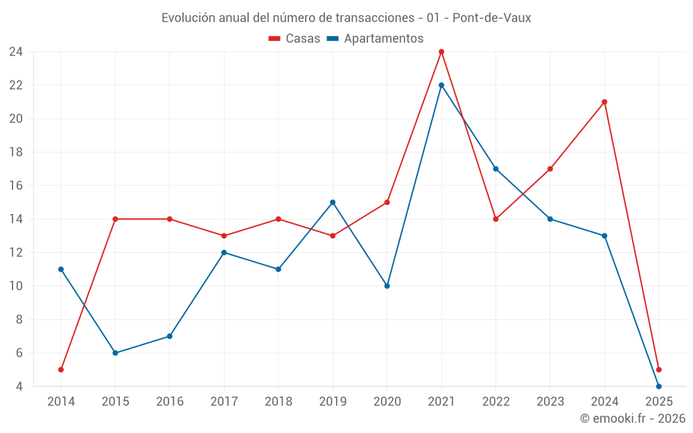 El precio mediano en las 19 transacciones de apartamentos de los últimos 24 meses en la comuna de Pont-de-Vaux fue de 1 542 € por metro cuadrado para un valor patrimonial medio de 120 280 €. Durante este período el 60% de las transacciones estuvieron entre 1 304 y 1 818 € por metro cuadrado (del 2º al 8º decil).