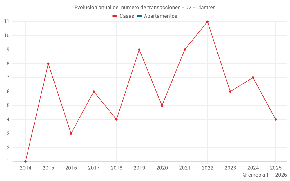El precio mediano en las 14 transacciones de casas de los últimos 24 meses en la comuna de Clastres fue de 1 120 € por metro cuadrado para un valor patrimonial medio de 121 000 €. Durante este período el 60% de las transacciones estuvieron entre 835 y 1 487 € por metro cuadrado (del 2º al 8º decil).