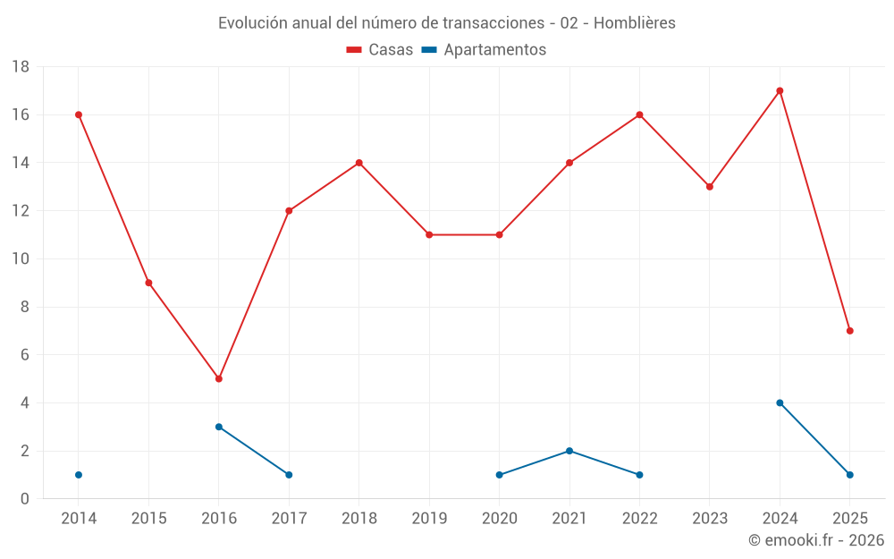 El precio mediano en las 21 transacciones de casas de los últimos 12 meses en la comuna de Homblières fue de 1 322 € por metro cuadrado para un valor patrimonial medio de 142 000 €. Durante este período el 60% de las transacciones estuvieron entre 721 y 1 672 € por metro cuadrado (del 2º al 8º decil).