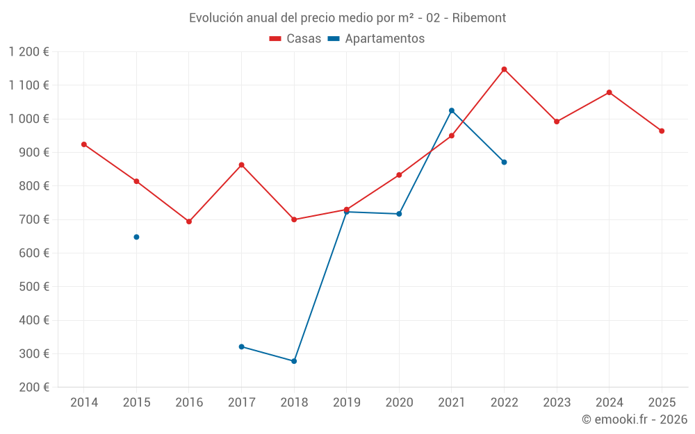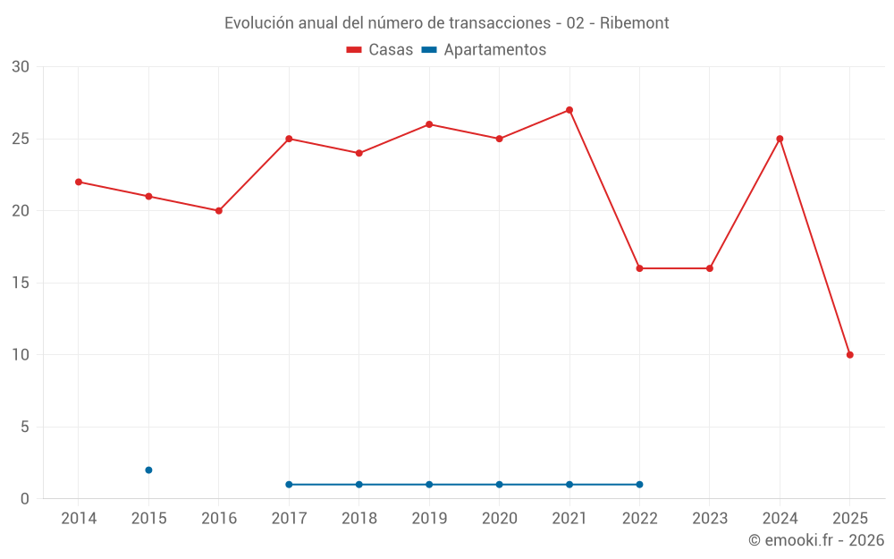 El precio mediano en las 25 transacciones de casas de los últimos 12 meses en la comuna de Ribemont fue de 1 027 € por metro cuadrado para un valor patrimonial medio de 93 000 €. Durante este período el 60% de las transacciones estuvieron entre 825 y 1 192 € por metro cuadrado (del 2º al 8º decil).