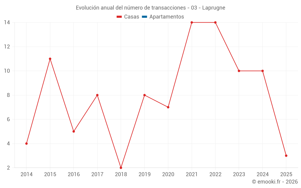 El precio mediano en las 18 transacciones de casas de los últimos 24 meses en la comuna de Laprugne fue de 571 € por metro cuadrado para un valor patrimonial medio de 60 000 €. Durante este período el 60% de las transacciones estuvieron entre 314 y 968 € por metro cuadrado (del 2º al 8º decil).
