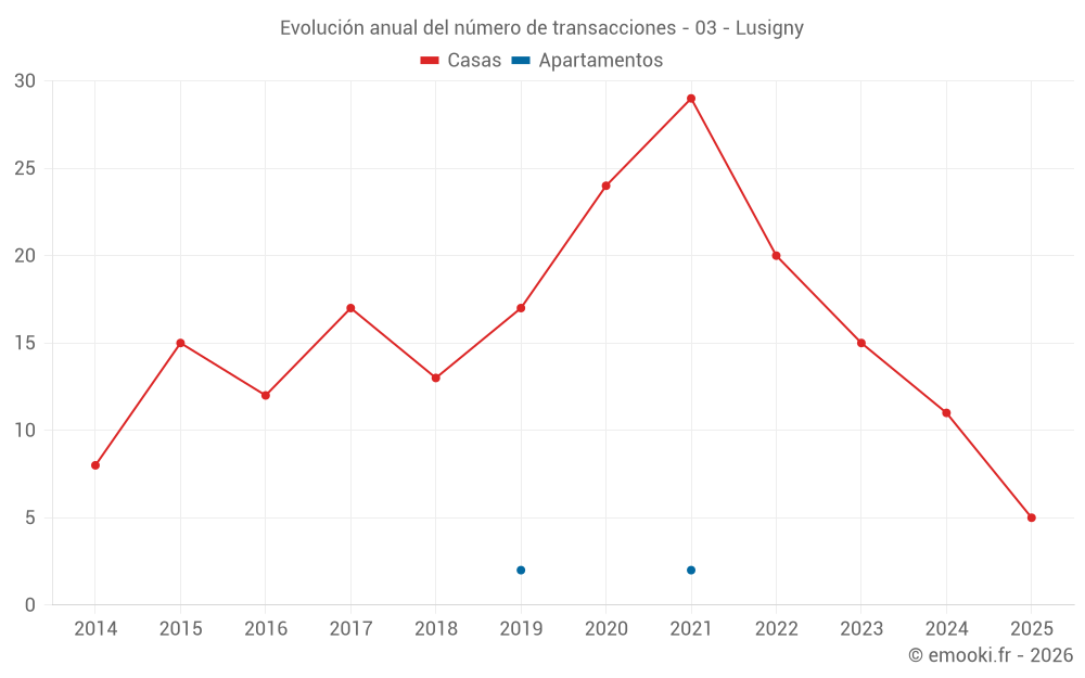 El precio mediano en las 24 transacciones de casas de los últimos 24 meses en la comuna de Lusigny fue de 1 374 € por metro cuadrado para un valor patrimonial medio de 120 000 €. Durante este período el 60% de las transacciones estuvieron entre 894 y 1 670 € por metro cuadrado (del 2º al 8º decil).