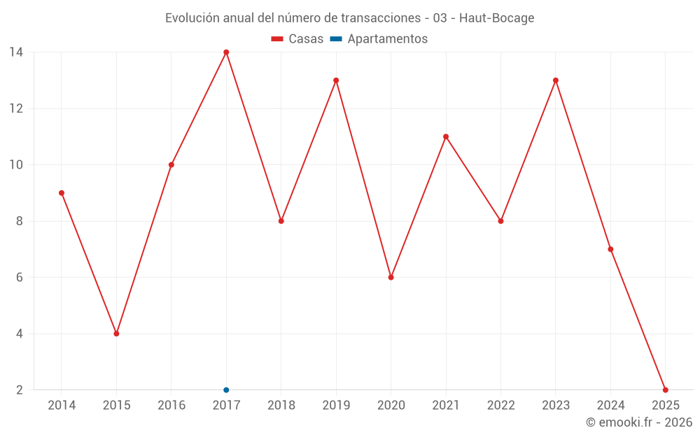El precio mediano en las 18 transacciones de casas de los últimos 24 meses en la comuna de Haut-Bocage fue de 958 € por metro cuadrado para un valor patrimonial medio de 95 780 €. Durante este período el 60% de las transacciones estuvieron entre 536 y 1 314 € por metro cuadrado (del 2º al 8º decil).