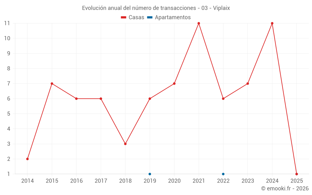 El precio mediano en las 17 transacciones de casas de los últimos 24 meses en la comuna de Viplaix fue de 516 € por metro cuadrado para un valor patrimonial medio de 40 000 €. Durante este período el 60% de las transacciones estuvieron entre 241 y 764 € por metro cuadrado (del 2º al 8º decil).