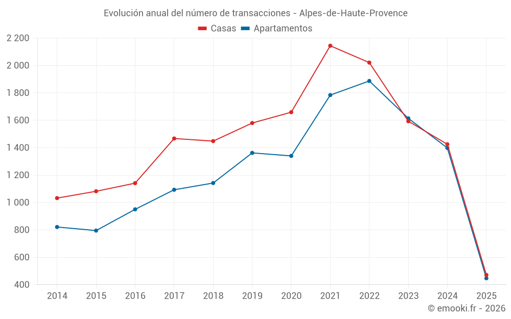 El precio mediano en las 106 transacciones de apartamentos de los últimos 3 meses en el departamento de Alpes-de-Haute-Provence fue de 2 272 € por metro cuadrado para un valor patrimonial medio de 92 000 €. Durante este período el 60% de las transacciones estuvieron entre 1 612 y 2 962 € por metro cuadrado (del 2º al 8º decil).