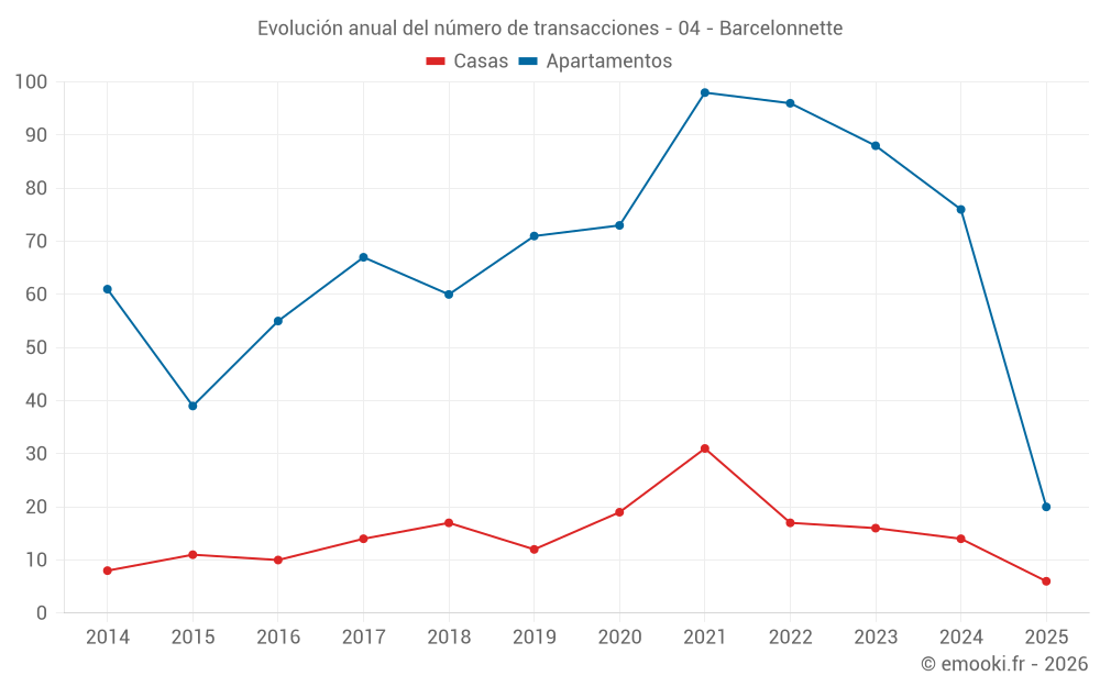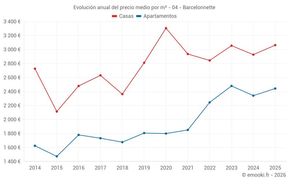 El precio mediano en las 20 transacciones de apartamentos de los últimos 6 meses en la comuna de Barcelonnette fue de 2 444 € por metro cuadrado para un valor patrimonial medio de 75 000 €. Durante este período el 60% de las transacciones estuvieron entre 1 522 y 2 754 € por metro cuadrado (del 2º al 8º decil).