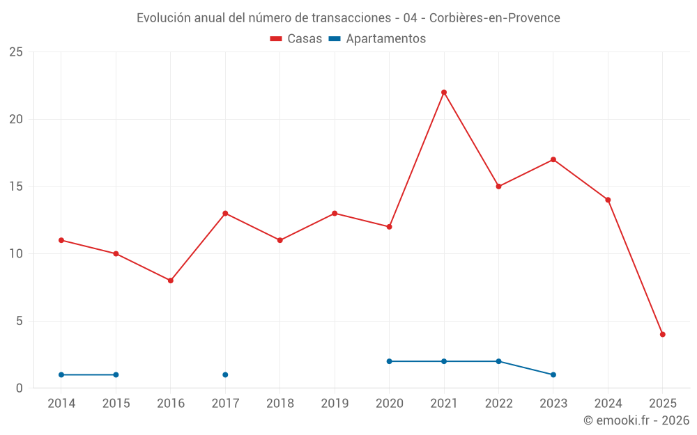 El precio mediano en las 27 transacciones de casas de los últimos 24 meses en la comuna de Corbières-en-Provence fue de 2 333 € por metro cuadrado para un valor patrimonial medio de 267 700 €. Durante este período el 60% de las transacciones estuvieron entre 1 866 y 2 997 € por metro cuadrado (del 2º al 8º decil).