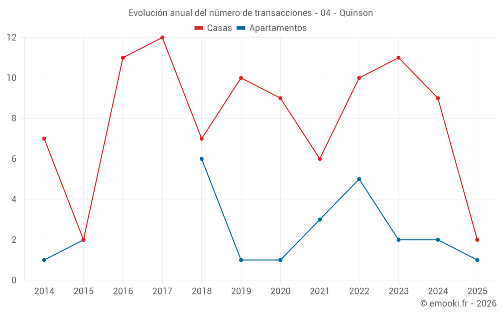 El precio mediano en las 17 transacciones de casas de los últimos 24 meses en la comuna de Quinson fue de 2 262 € por metro cuadrado para un valor patrimonial medio de 163 660 €. Durante este período el 60% de las transacciones estuvieron entre 1 120 y 3 082 € por metro cuadrado (del 2º al 8º decil).