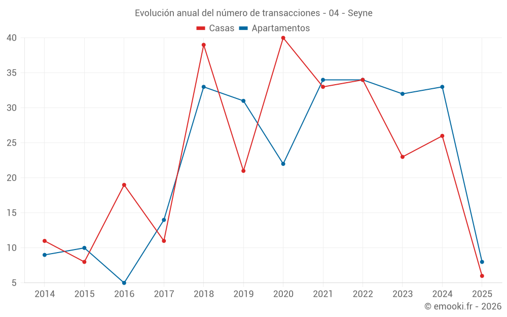 El precio mediano en las 26 transacciones de apartamentos de los últimos 12 meses en la comuna de Seyne fue de 1 408 € por metro cuadrado para un valor patrimonial medio de 51 632 €. Durante este período el 60% de las transacciones estuvieron entre 1 170 y 1 681 € por metro cuadrado (del 2º al 8º decil).