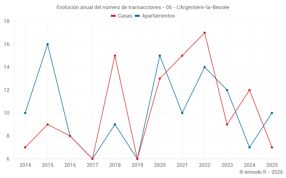 El precio mediano en las 25 transacciones de apartamentos de los últimos 24 meses en la comuna de L'Argentière-la-Bessée fue de 1 964 € por metro cuadrado para un valor patrimonial medio de 150 000 €. Durante este período el 60% de las transacciones estuvieron entre 1 469 y 2 229 € por metro cuadrado (del 2º al 8º decil).