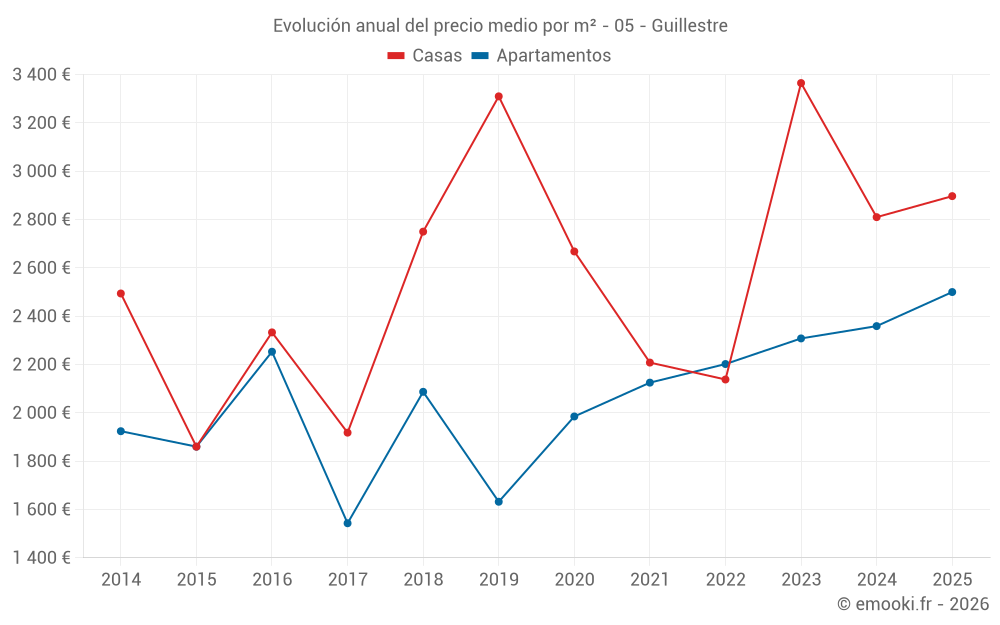 El precio mediano en las 23 transacciones de casas de los últimos 24 meses en la comuna de Guillestre fue de 2 857 € por metro cuadrado para un valor patrimonial medio de 350 000 €. Durante este período el 60% de las transacciones estuvieron entre 1 405 y 4 056 € por metro cuadrado (del 2º al 8º decil).