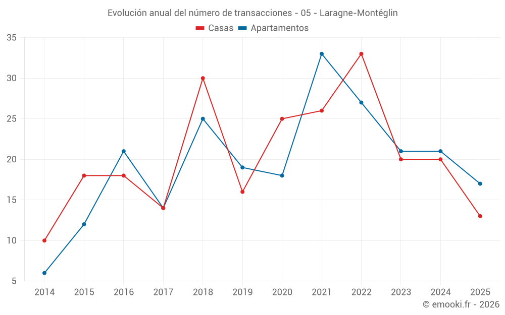 El precio mediano en las 22 transacciones de casas de los últimos 12 meses en la comuna de Laragne-Montéglin fue de 2 300 € por metro cuadrado para un valor patrimonial medio de 173 750 €. Durante este período el 60% de las transacciones estuvieron entre 1 509 y 2 539 € por metro cuadrado (del 2º al 8º decil).