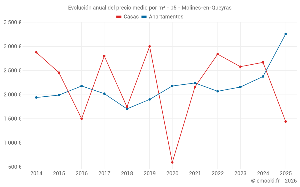 El precio mediano en las 16 transacciones de apartamentos de los últimos 12 meses en la comuna de Molines-en-Queyras fue de 2 678 € por metro cuadrado para un valor patrimonial medio de 118 735 €. Durante este período el 60% de las transacciones estuvieron entre 2 375 y 3 337 € por metro cuadrado (del 2º al 8º decil).