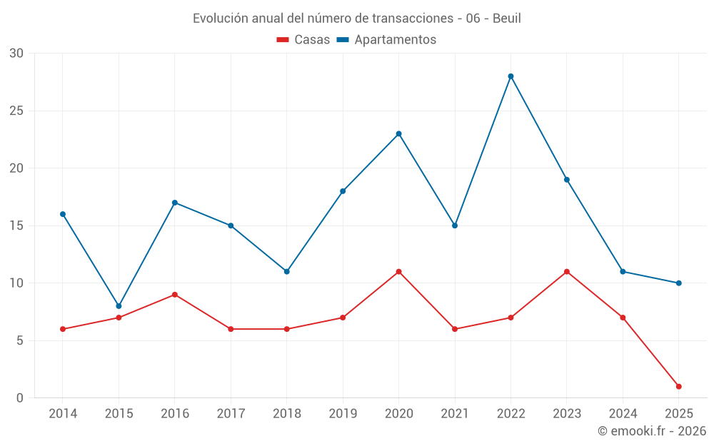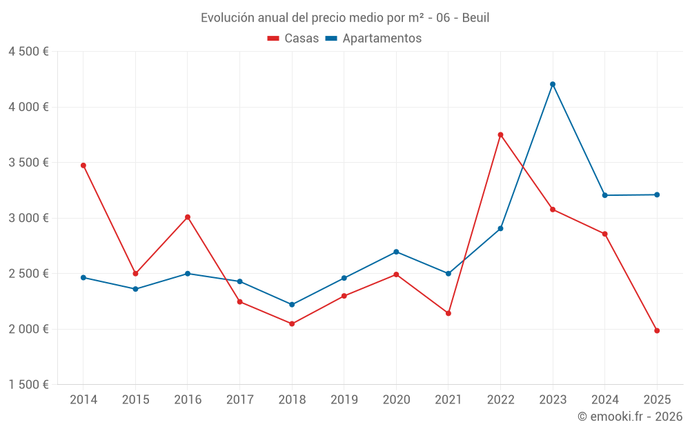 El precio mediano en las 17 transacciones de apartamentos de los últimos 12 meses en la comuna de Beuil fue de 3 167 € por metro cuadrado para un valor patrimonial medio de 100 000 €. Durante este período el 60% de las transacciones estuvieron entre 2 580 y 4 164 € por metro cuadrado (del 2º al 8º decil).