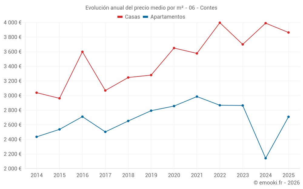 El precio mediano en las 25 transacciones de casas de los últimos 12 meses en la comuna de Contes fue de 3 992 € por metro cuadrado para un valor patrimonial medio de 363 000 €. Durante este período el 60% de las transacciones estuvieron entre 2 879 y 5 134 € por metro cuadrado (del 2º al 8º decil).