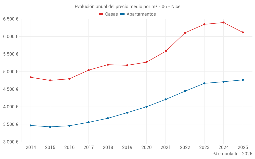 El precio mediano en las 57 transacciones de casas de los últimos 3 meses en la comuna de Nice fue de 6 932 € por metro cuadrado para un valor patrimonial medio de 723 250 €. Durante este período el 60% de las transacciones estuvieron entre 4 119 y 11 574 € por metro cuadrado (del 2º al 8º decil).