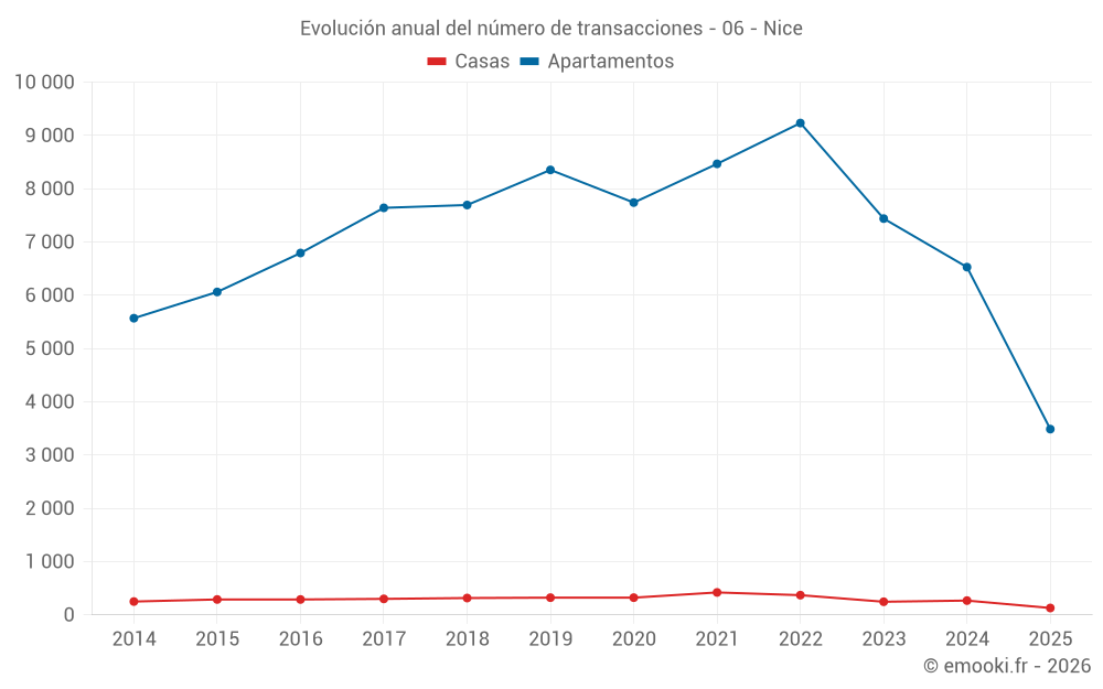 El precio mediano en las 1715 transacciones de apartamentos de los últimos 3 meses en la comuna de Nice fue de 4 756 € por metro cuadrado para un valor patrimonial medio de 233 300 €. Durante este período el 60% de las transacciones estuvieron entre 3 571 y 6 263 € por metro cuadrado (del 2º al 8º decil).