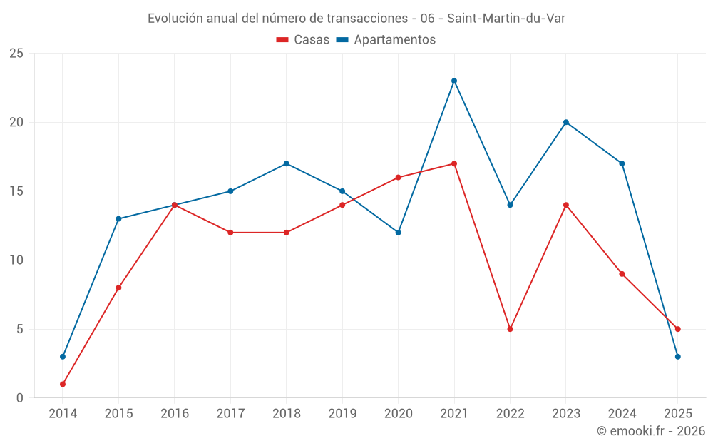 El precio mediano en las 24 transacciones de apartamentos de los últimos 24 meses en la comuna de Saint-Martin-du-Var fue de 3 812 € por metro cuadrado para un valor patrimonial medio de 221 500 €. Durante este período el 60% de las transacciones estuvieron entre 2 804 y 4 784 € por metro cuadrado (del 2º al 8º decil).