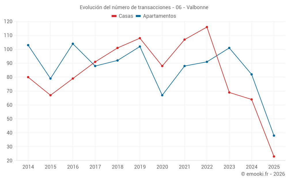 El precio mediano en las 23 transacciones de casas de los últimos 6 meses en la comuna de Valbonne fue de 6 076 € por metro cuadrado para un valor patrimonial medio de 679 245 €. Durante este período el 60% de las transacciones estuvieron entre 4 514 y 7 559 € por metro cuadrado (del 2º al 8º decil).