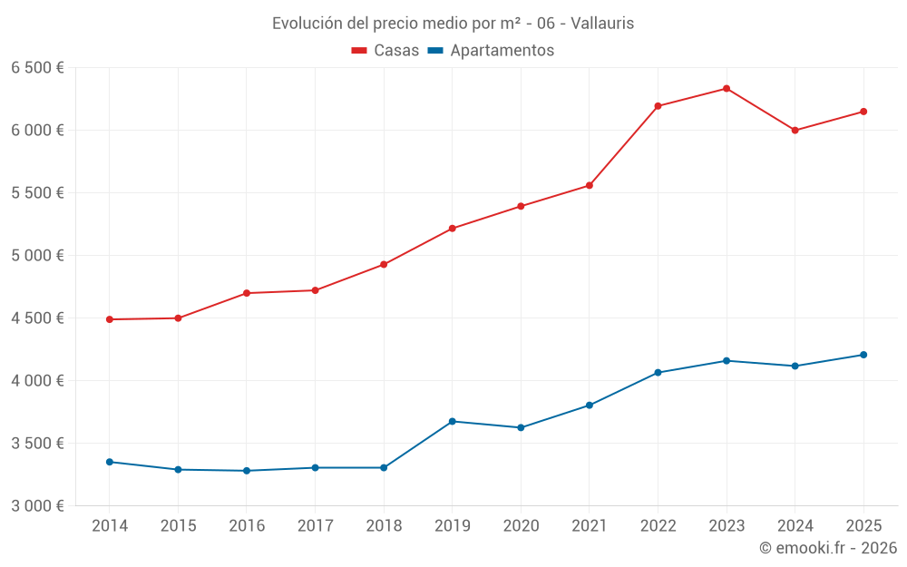 El precio mediano en las 25 transacciones de casas de los últimos 3 meses en la comuna de Vallauris fue de 5 150 € por metro cuadrado para un valor patrimonial medio de 601 110 €. Durante este período el 60% de las transacciones estuvieron entre 3 424 y 7 172 € por metro cuadrado (del 2º al 8º decil).