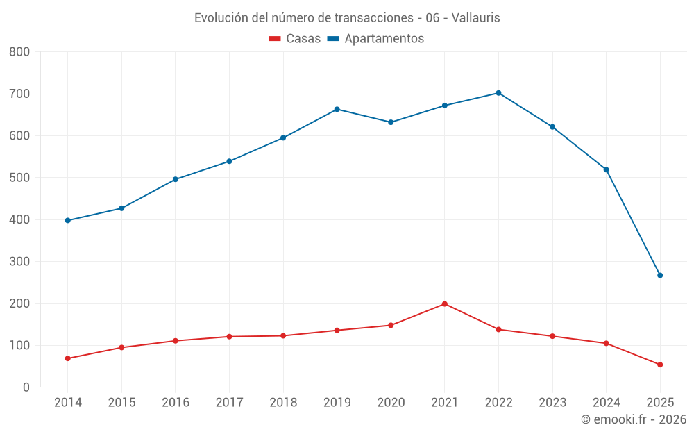 El precio mediano en las 133 transacciones de apartamentos de los últimos 3 meses en la comuna de Vallauris fue de 4 286 € por metro cuadrado para un valor patrimonial medio de 173 000 €. Durante este período el 60% de las transacciones estuvieron entre 3 020 y 5 725 € por metro cuadrado (del 2º al 8º decil).