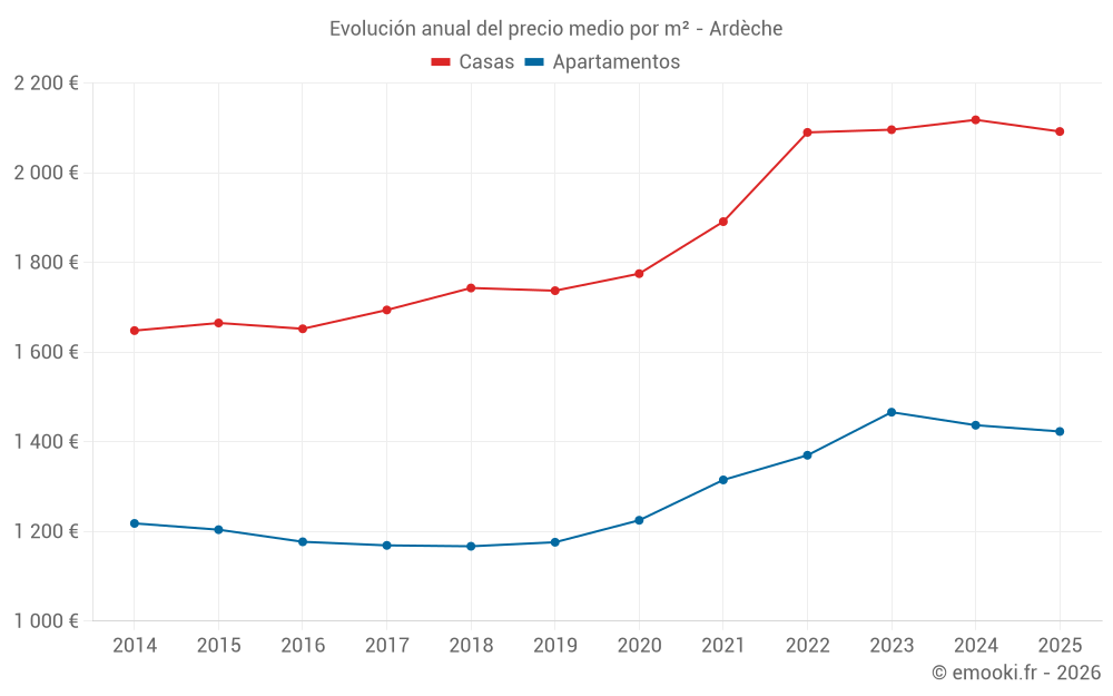 El precio mediano en las 432 transacciones de casas de los últimos 3 meses en el departamento de Ardèche fue de 2 112 € por metro cuadrado para un valor patrimonial medio de 180 000 €. Durante este período el 60% de las transacciones estuvieron entre 1 273 y 2 859 € por metro cuadrado (del 2º al 8º decil).