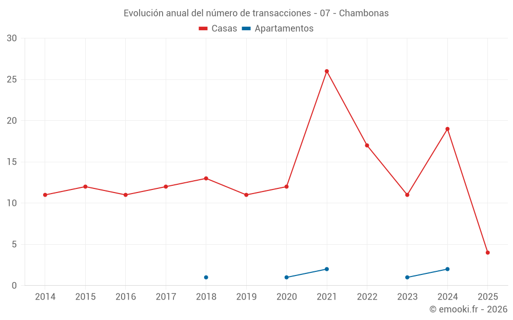 El precio mediano en las 16 transacciones de casas de los últimos 12 meses en la comuna de Chambonas fue de 2 574 € por metro cuadrado para un valor patrimonial medio de 269 668 €. Durante este período el 60% de las transacciones estuvieron entre 2 114 y 3 456 € por metro cuadrado (del 2º al 8º decil).
