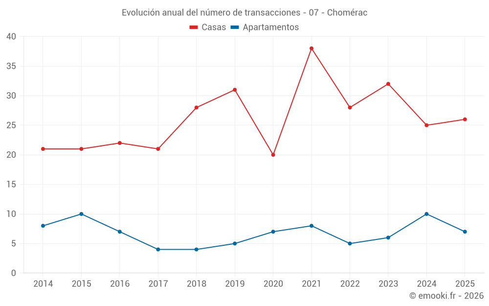 El precio mediano en las 18 transacciones de casas de los últimos 6 meses en la comuna de Chomérac fue de 2 401 € por metro cuadrado para un valor patrimonial medio de 217 700 €. Durante este período el 60% de las transacciones estuvieron entre 1 856 y 2 928 € por metro cuadrado (del 2º al 8º decil).