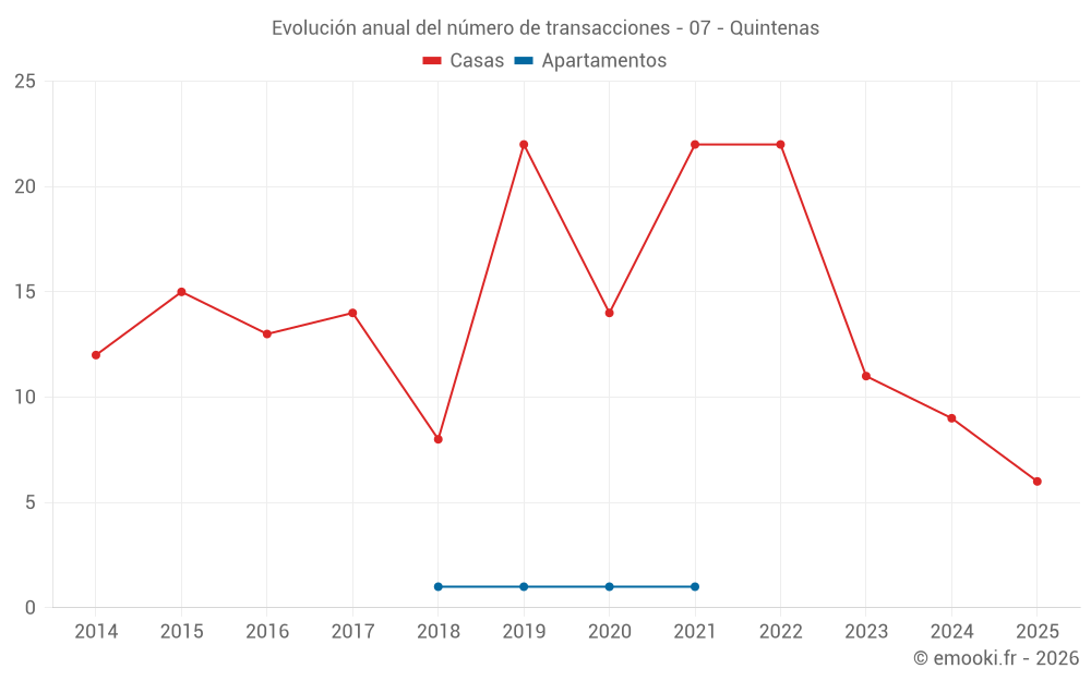 El precio mediano en las 23 transacciones de casas de los últimos 24 meses en la comuna de Quintenas fue de 2 216 € por metro cuadrado para un valor patrimonial medio de 177 750 €. Durante este período el 60% de las transacciones estuvieron entre 1 630 y 2 519 € por metro cuadrado (del 2º al 8º decil).
