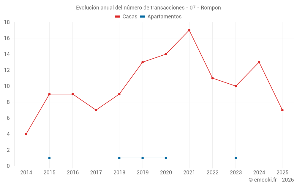 El precio mediano en las 25 transacciones de casas de los últimos 24 meses en la comuna de Rompon fue de 2 512 € por metro cuadrado para un valor patrimonial medio de 250 000 €. Durante este período el 60% de las transacciones estuvieron entre 1 184 y 3 076 € por metro cuadrado (del 2º al 8º decil).