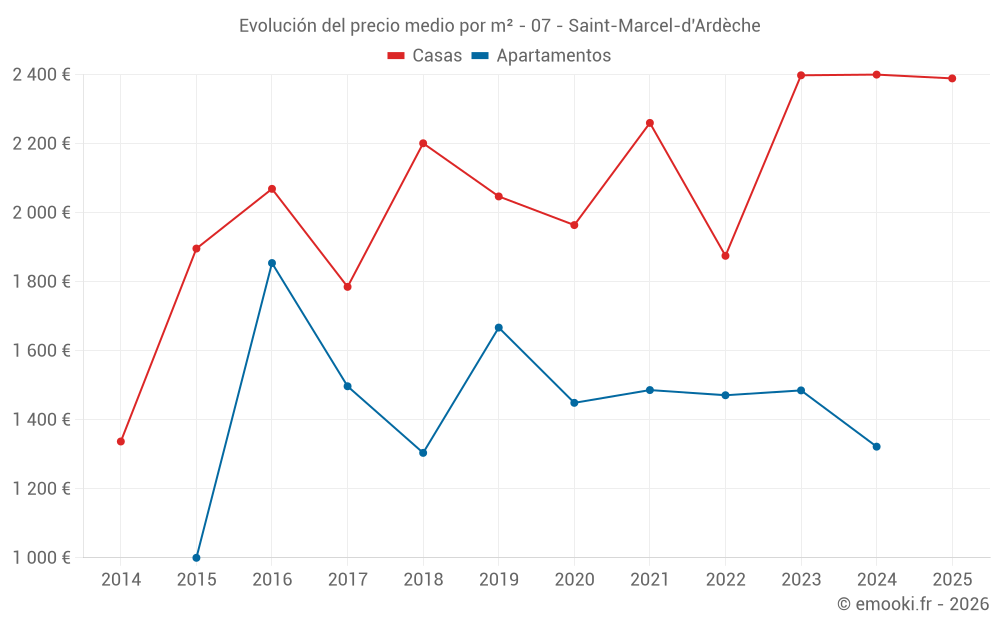 El precio mediano en las 20 transacciones de casas de los últimos 12 meses en la comuna de Saint-Marcel-d'Ardèche fue de 2 458 € por metro cuadrado para un valor patrimonial medio de 240 500 €. Durante este período el 60% de las transacciones estuvieron entre 1 549 y 2 940 € por metro cuadrado (del 2º al 8º decil).