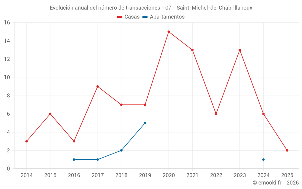 El precio mediano en las 15 transacciones de casas de los últimos 24 meses en la comuna de Saint-Michel-de-Chabrillanoux fue de 2 315 € por metro cuadrado para un valor patrimonial medio de 190 000 €. Durante este período el 60% de las transacciones estuvieron entre 1 217 y 3 155 € por metro cuadrado (del 2º al 8º decil).