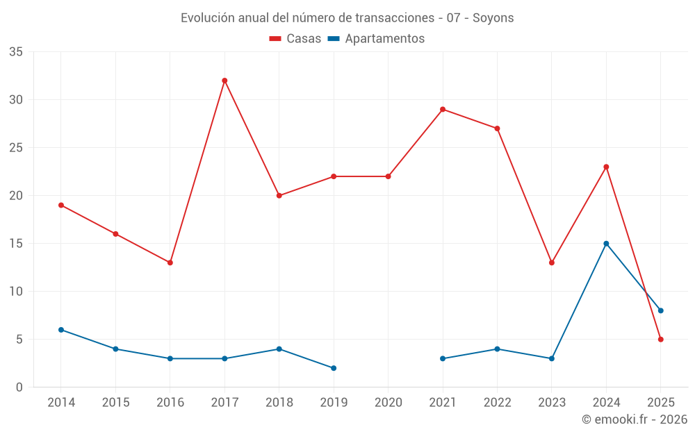 El precio mediano en las 34 transacciones de casas de los últimos 24 meses en la comuna de Soyons fue de 2 728 € por metro cuadrado para un valor patrimonial medio de 298 800 €. Durante este período el 60% de las transacciones estuvieron entre 1 889 y 3 480 € por metro cuadrado (del 2º al 8º decil).