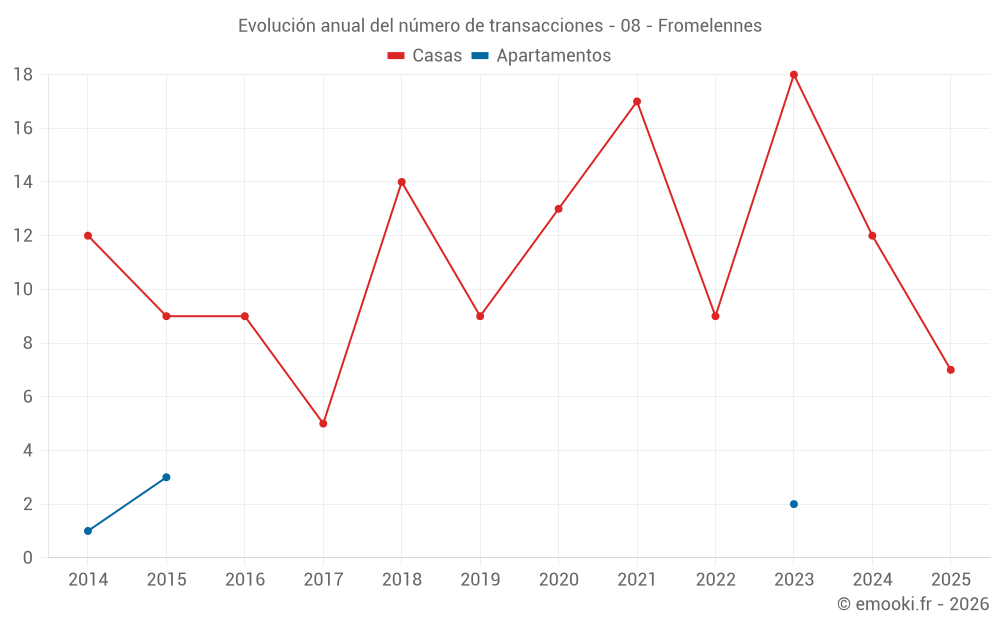 El precio mediano en las 33 transacciones de casas de los últimos 24 meses en la comuna de Fromelennes fue de 1 492 € por metro cuadrado para un valor patrimonial medio de 135 900 €. Durante este período el 60% de las transacciones estuvieron entre 1 103 y 1 756 € por metro cuadrado (del 2º al 8º decil).