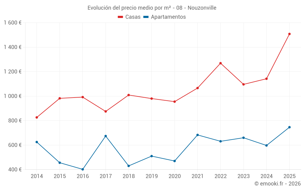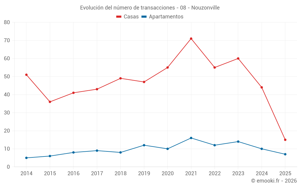 El precio mediano en las 24 transacciones de apartamentos de los últimos 24 meses en la comuna de Nouzonville fue de 629 € por metro cuadrado para un valor patrimonial medio de 44 125 €. Durante este período el 60% de las transacciones estuvieron entre 395 y 811 € por metro cuadrado (del 2º al 8º decil).