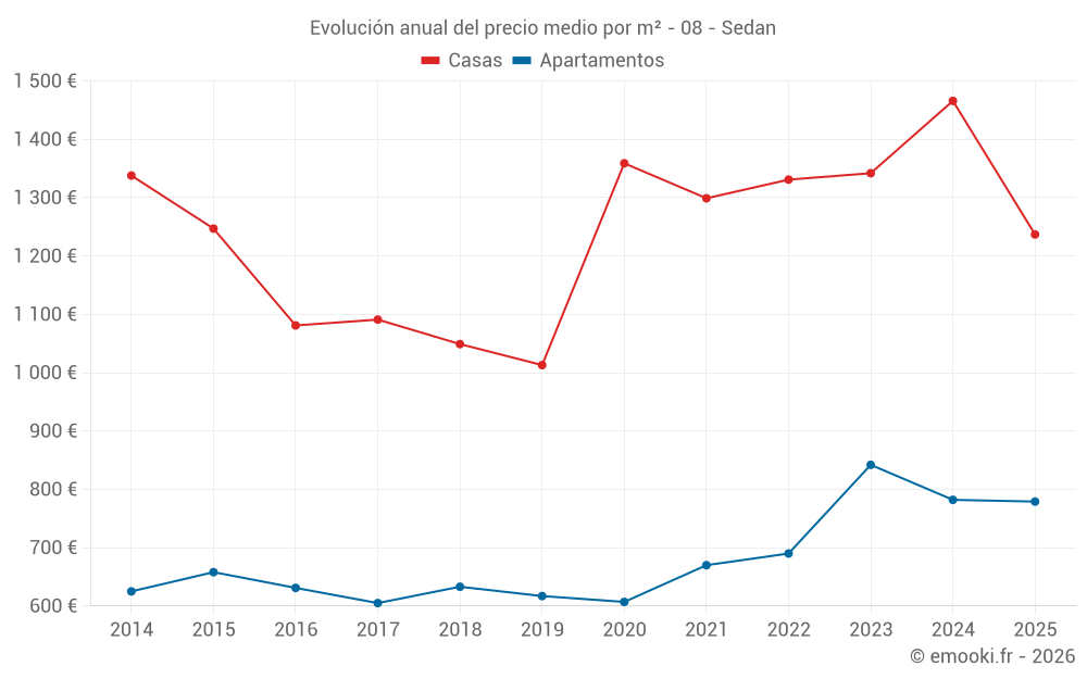 El precio mediano en las 24 transacciones de casas de los últimos 6 meses en la comuna de Sedan fue de 1 237 € por metro cuadrado para un valor patrimonial medio de 109 000 €. Durante este período el 60% de las transacciones estuvieron entre 766 y 1 500 € por metro cuadrado (del 2º al 8º decil).