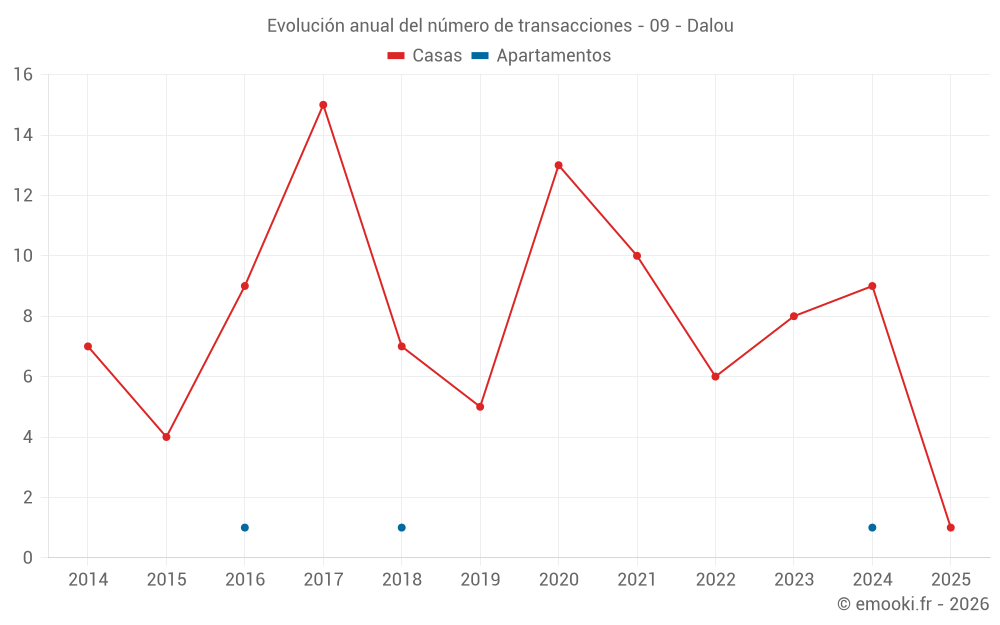 El precio mediano en las 15 transacciones de casas de los últimos 24 meses en la comuna de Dalou fue de 1 650 € por metro cuadrado para un valor patrimonial medio de 145 000 €. Durante este período el 60% de las transacciones estuvieron entre 1 255 y 2 056 € por metro cuadrado (del 2º al 8º decil).