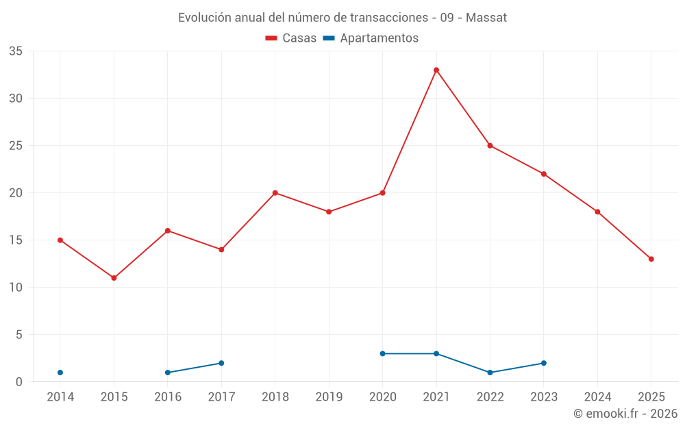 El precio mediano en las 24 transacciones de casas de los últimos 12 meses en la comuna de Massat fue de 1 110 € por metro cuadrado para un valor patrimonial medio de 64 900 €. Durante este período el 60% de las transacciones estuvieron entre 516 y 1 899 € por metro cuadrado (del 2º al 8º decil).