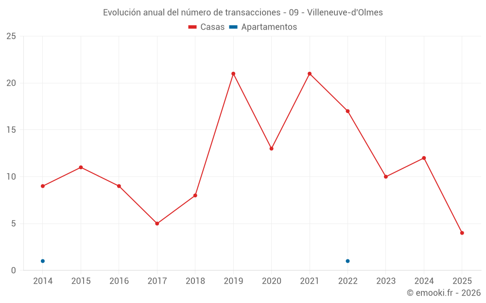 El precio mediano en las 18 transacciones de casas de los últimos 24 meses en la comuna de Villeneuve-d'Olmes fue de 1 029 € por metro cuadrado para un valor patrimonial medio de 81 250 €. Durante este período el 60% de las transacciones estuvieron entre 520 y 1 346 € por metro cuadrado (del 2º al 8º decil).