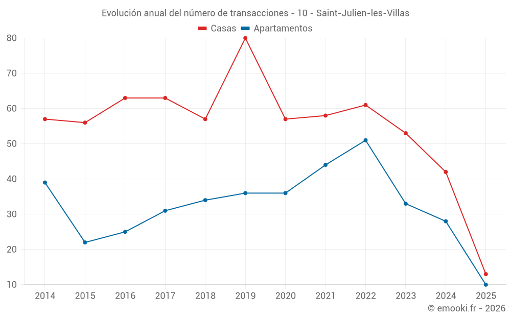 El precio mediano en las 26 transacciones de apartamentos de los últimos 12 meses en la comuna de Saint-Julien-les-Villas fue de 1 418 € por metro cuadrado para un valor patrimonial medio de 81 000 €. Durante este período el 60% de las transacciones estuvieron entre 1 061 y 1 667 € por metro cuadrado (del 2º al 8º decil).