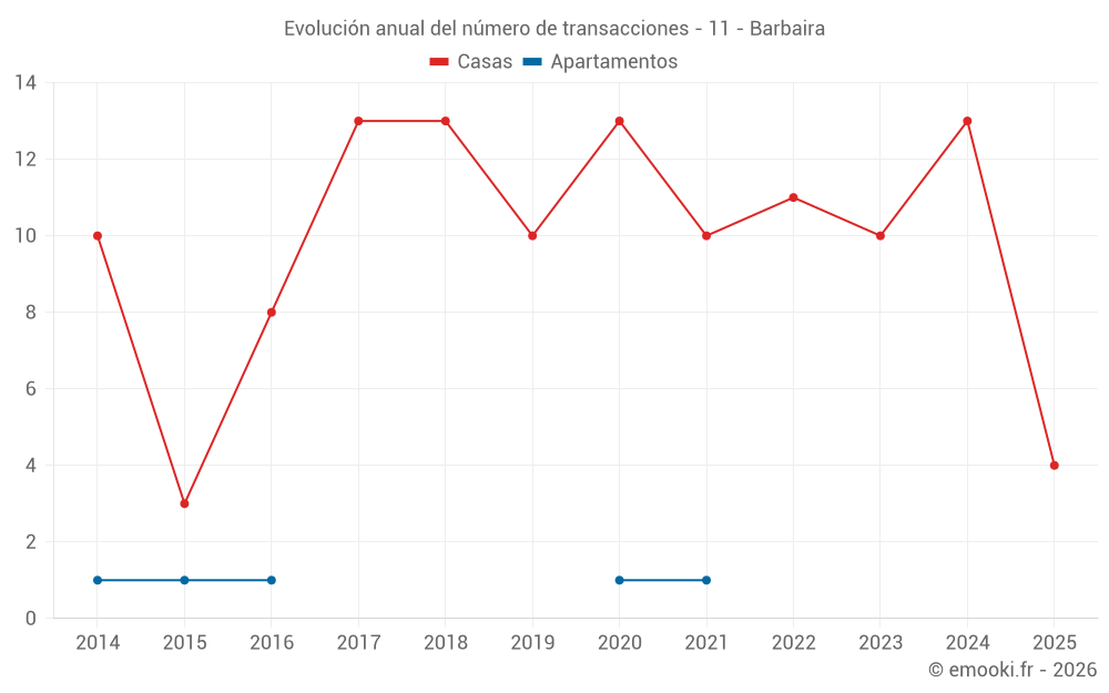 El precio mediano en las 25 transacciones de casas de los últimos 24 meses en la comuna de Barbaira fue de 1 364 € por metro cuadrado para un valor patrimonial medio de 144 800 €. Durante este período el 60% de las transacciones estuvieron entre 628 y 1 983 € por metro cuadrado (del 2º al 8º decil).