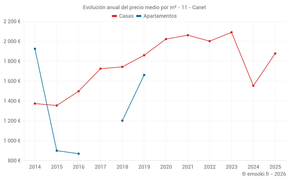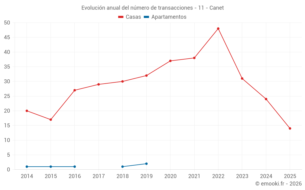 El precio mediano en las 26 transacciones de casas de los últimos 12 meses en la comuna de Canet fue de 1 580 € por metro cuadrado para un valor patrimonial medio de 196 125 €. Durante este período el 60% de las transacciones estuvieron entre 1 144 y 2 386 € por metro cuadrado (del 2º al 8º decil).
