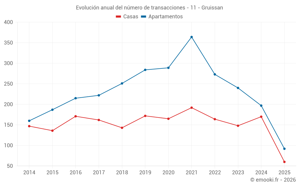 El precio mediano en las 29 transacciones de casas de los últimos 3 meses en la comuna de Gruissan fue de 5 422 € por metro cuadrado para un valor patrimonial medio de 198 315 €. Durante este período el 60% de las transacciones estuvieron entre 4 346 y 5 909 € por metro cuadrado (del 2º al 8º decil).
