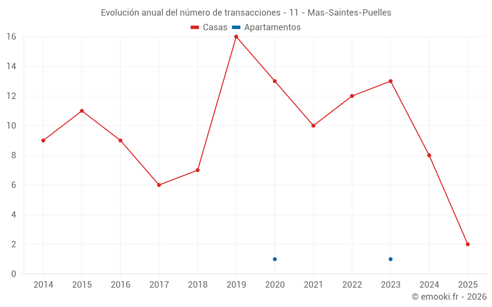 El precio mediano en las 18 transacciones de casas de los últimos 24 meses en la comuna de Mas-Saintes-Puelles fue de 1 690 € por metro cuadrado para un valor patrimonial medio de 158 850 €. Durante este período el 60% de las transacciones estuvieron entre 1 387 y 2 475 € por metro cuadrado (del 2º al 8º decil).