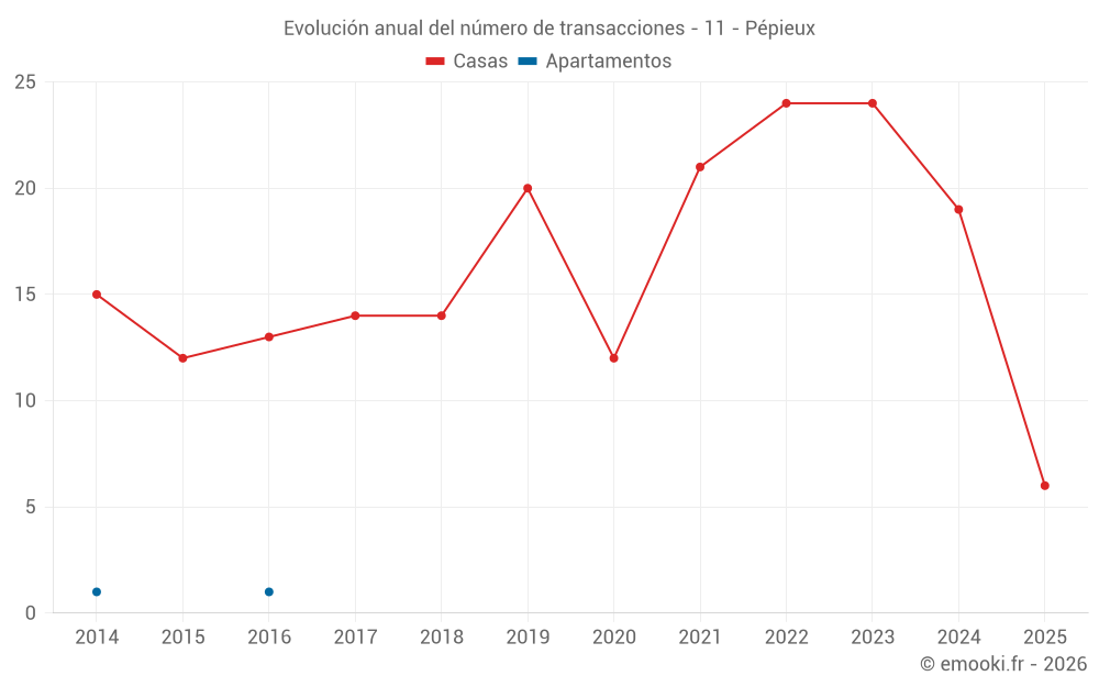 El precio mediano en las 17 transacciones de casas de los últimos 12 meses en la comuna de Pépieux fue de 1 525 € por metro cuadrado para un valor patrimonial medio de 112 000 €. Durante este período el 60% de las transacciones estuvieron entre 931 y 2 136 € por metro cuadrado (del 2º al 8º decil).