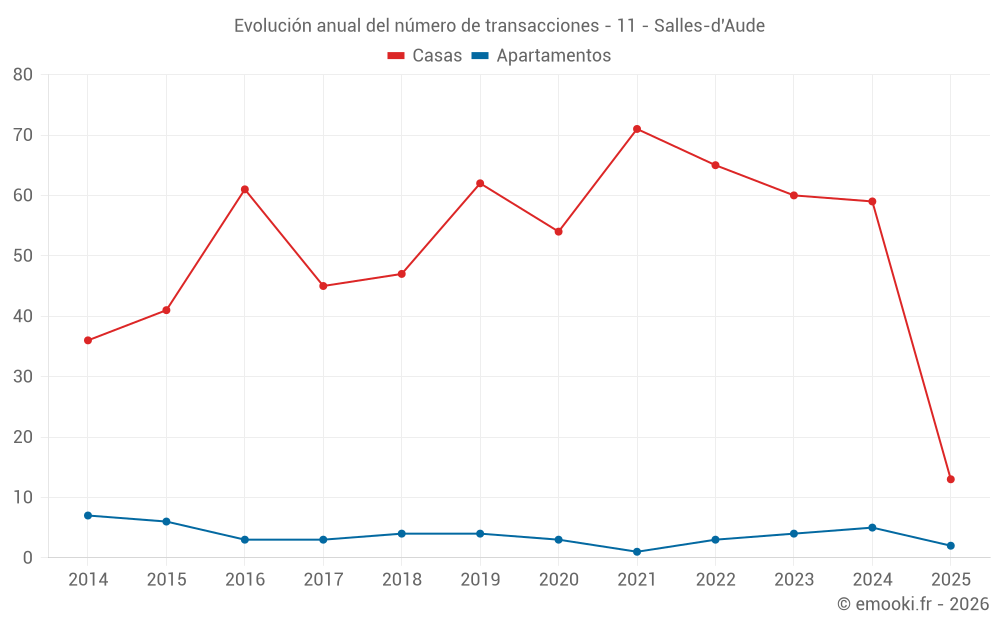 El precio mediano en las 49 transacciones de casas de los últimos 12 meses en la comuna de Salles-d'Aude fue de 2 561 € por metro cuadrado para un valor patrimonial medio de 234 700 €. Durante este período el 60% de las transacciones estuvieron entre 1 637 y 2 931 € por metro cuadrado (del 2º al 8º decil).